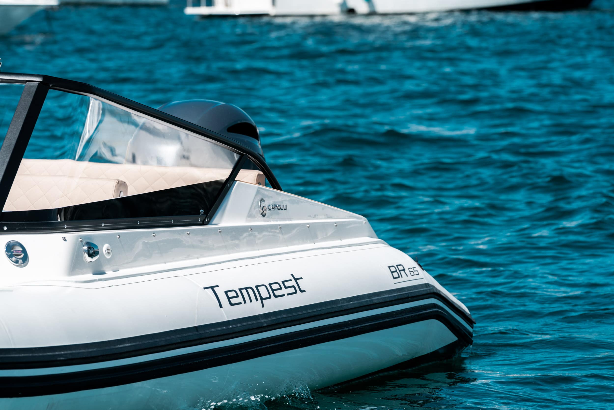 The Tempest BR 65, is not a simple rigid inflatable boat, but it stands out as the starting point to a new boat concept. Its attractive design and modern lines, made sporty by the colouring in grey livery, will catch your eye from the very first sight.