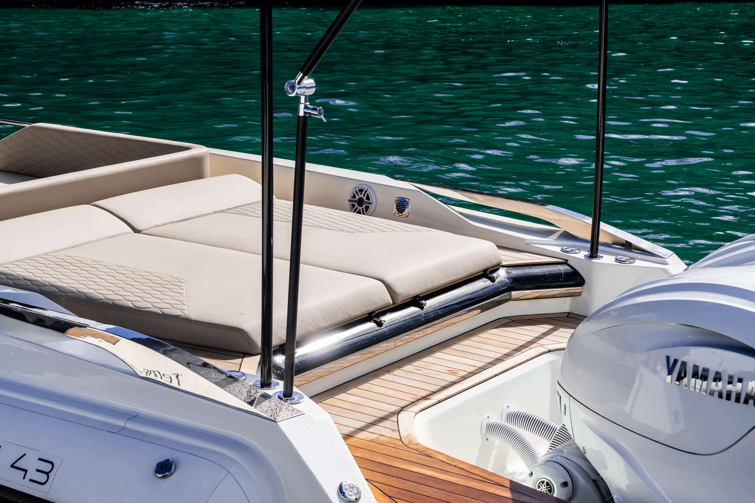 - Full teak covering (stern platform, cockpit, bow)
