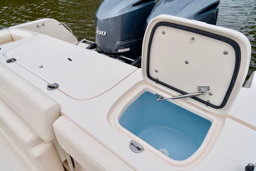 • Livewell – 32-gallon (121.1 l) aft insulated raw water livewell w/light, full column distribution inlet & ob drain (1100 GPH pump) (4164 LPH)