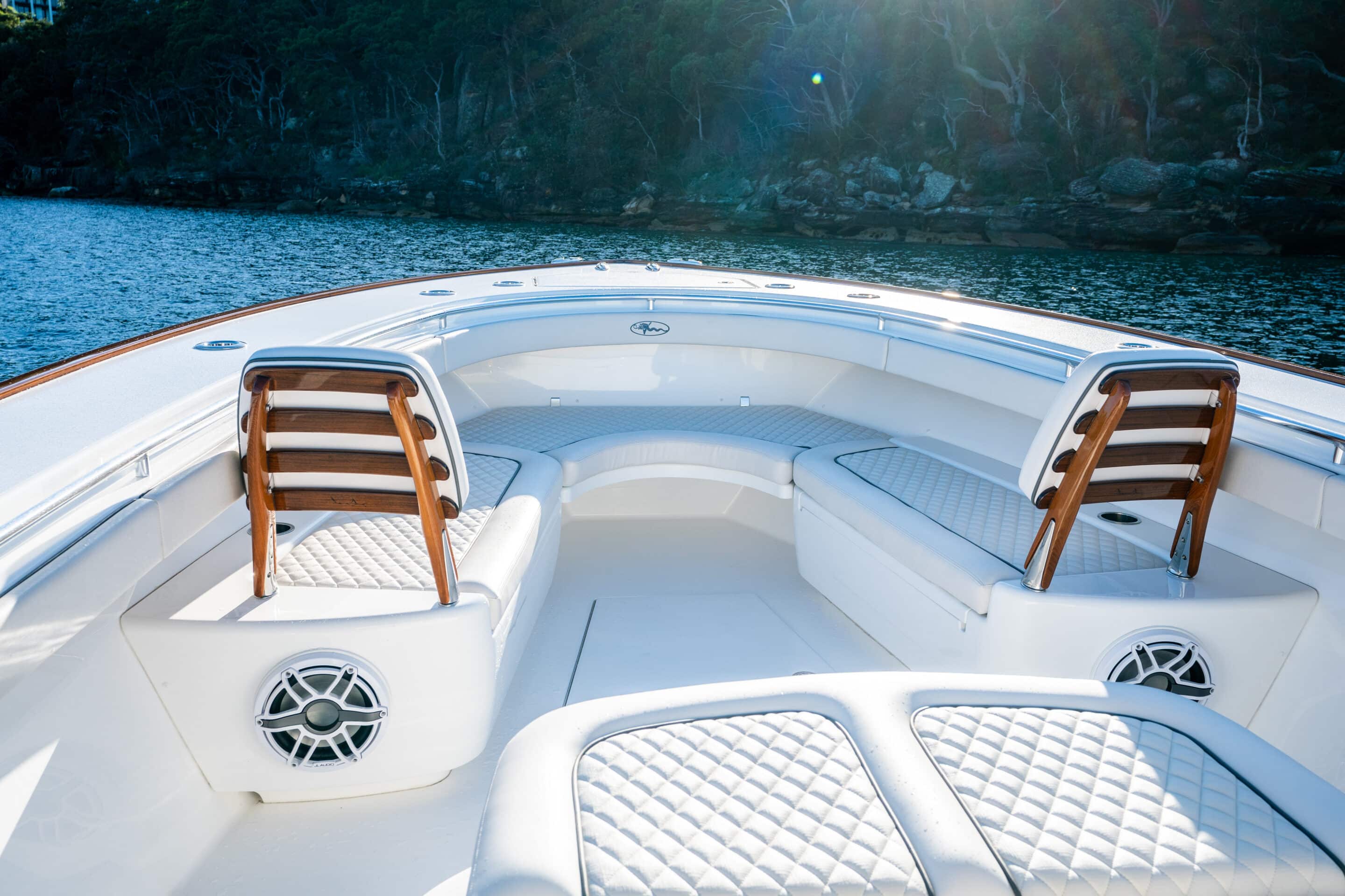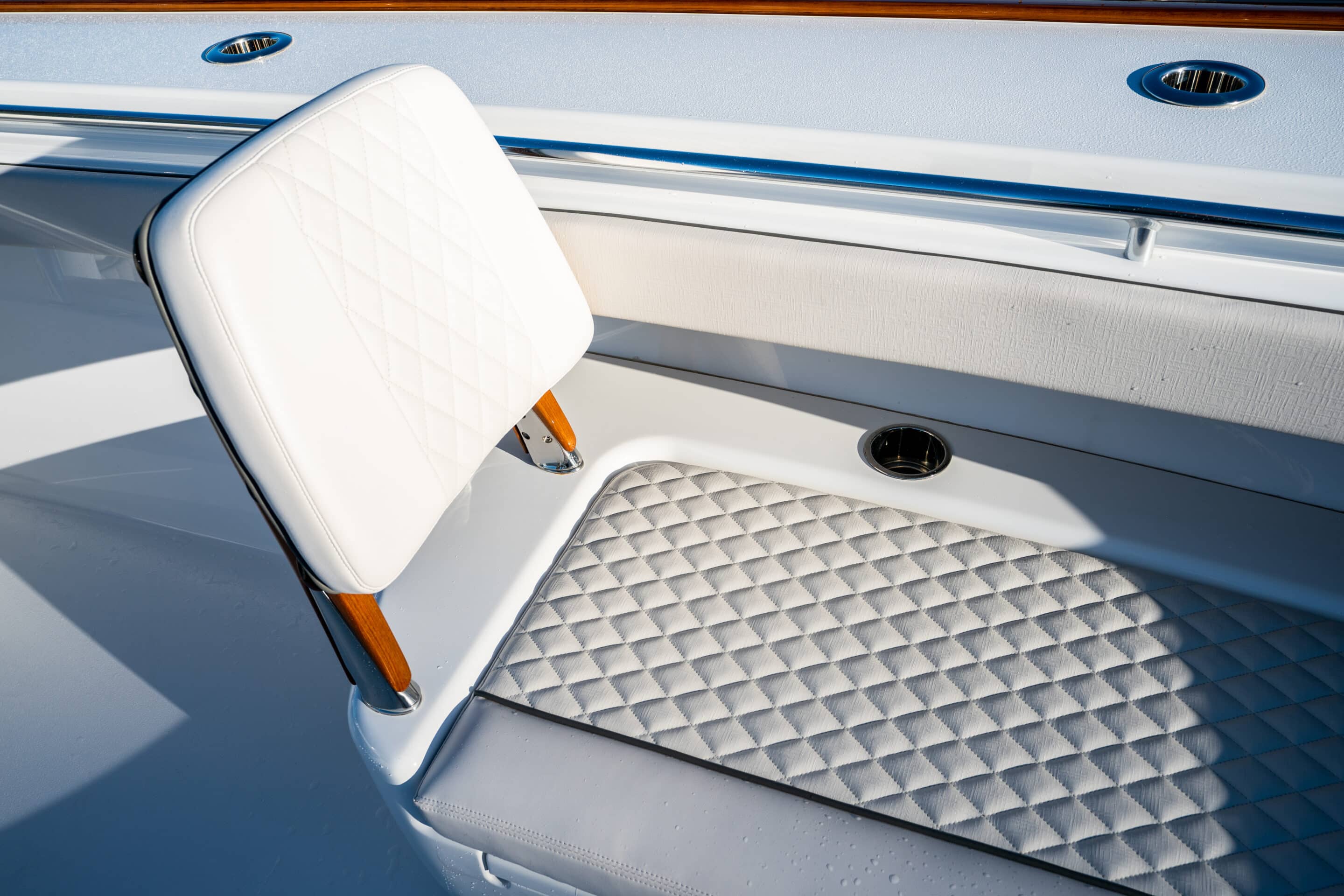 - Durable white outdoor upholstery for console lounge, bench seating, coaming bolsters and cockpit cooler seating