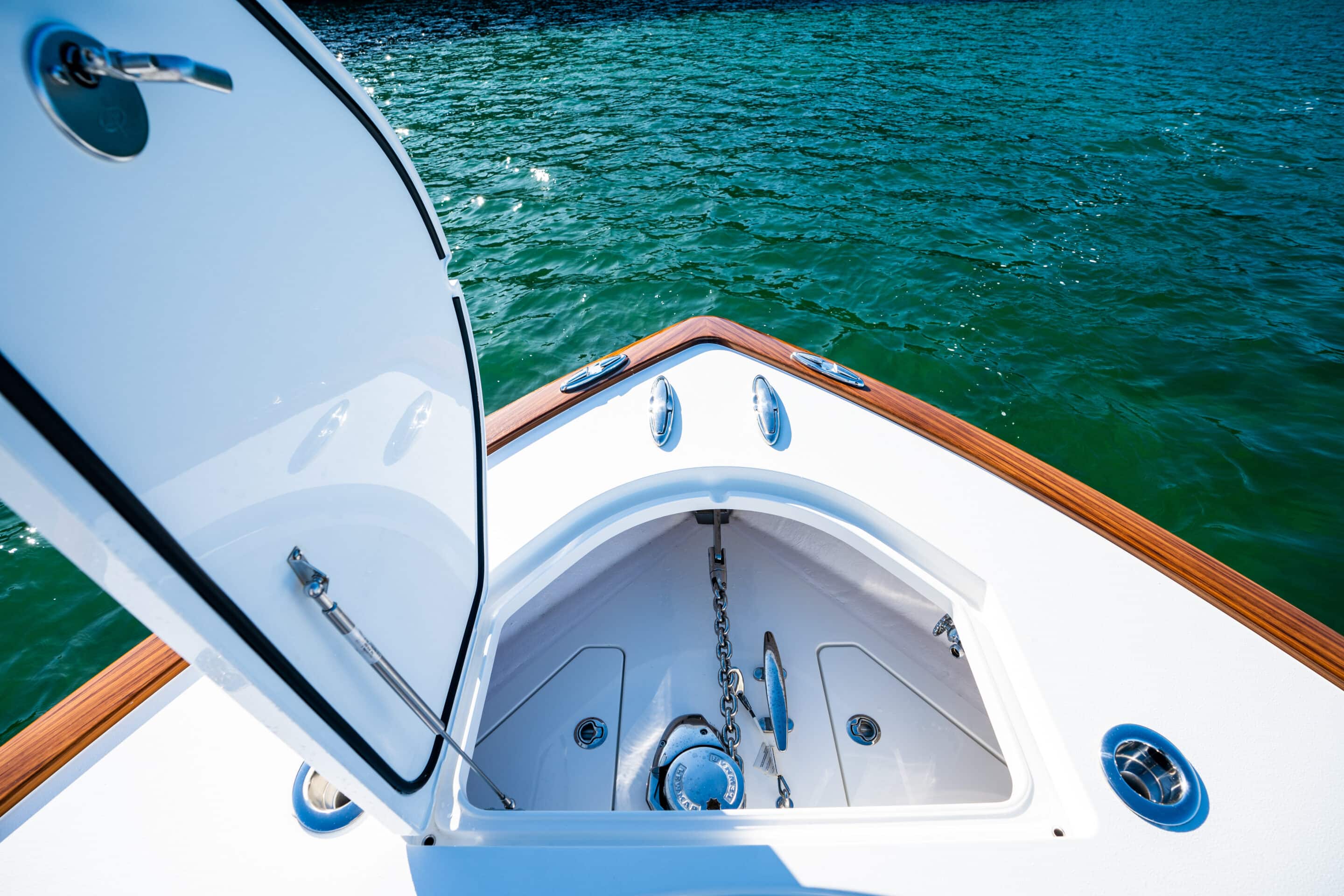 - Forward anchor locker with built in anchor tube and shelf, painted Awlgrip finish