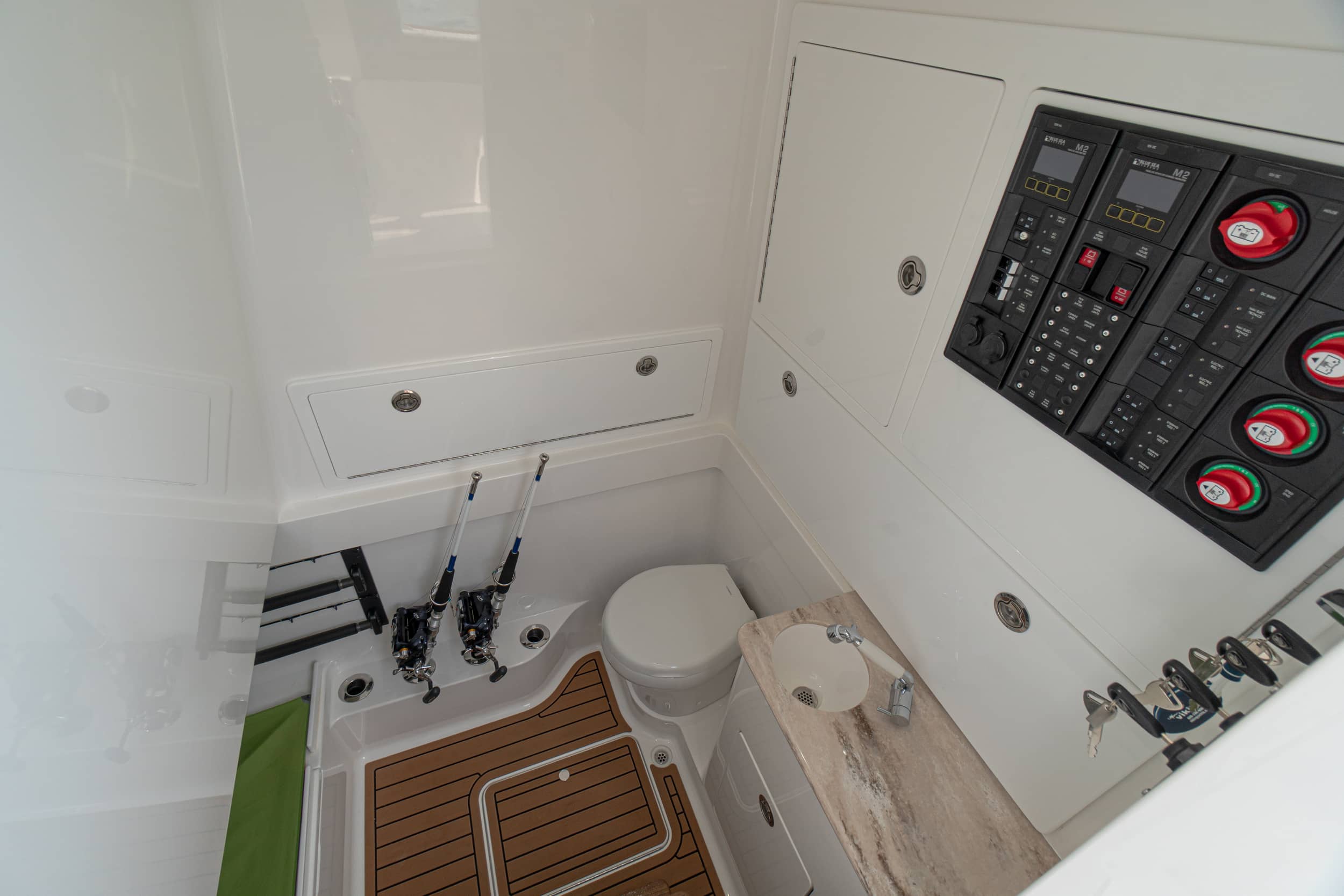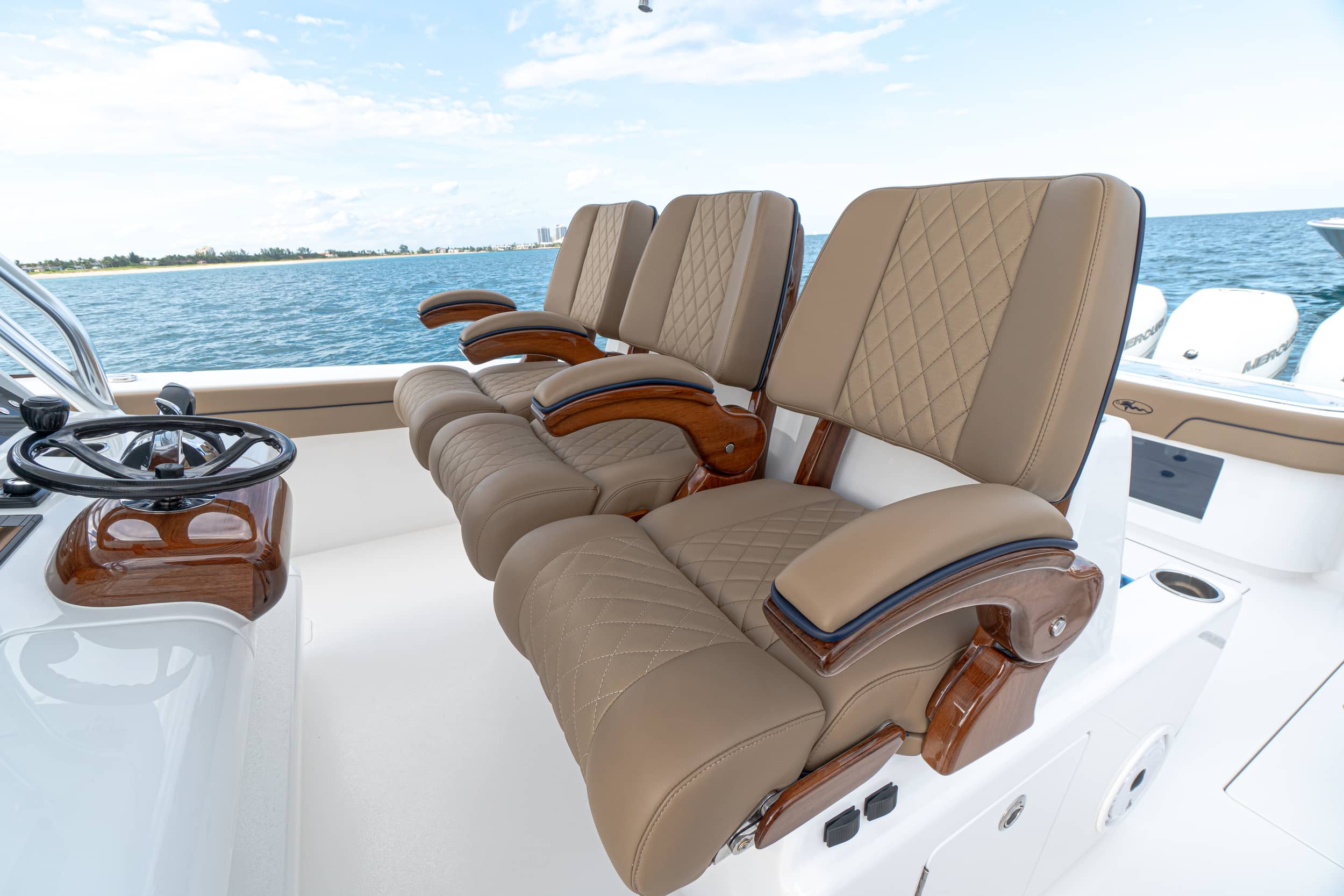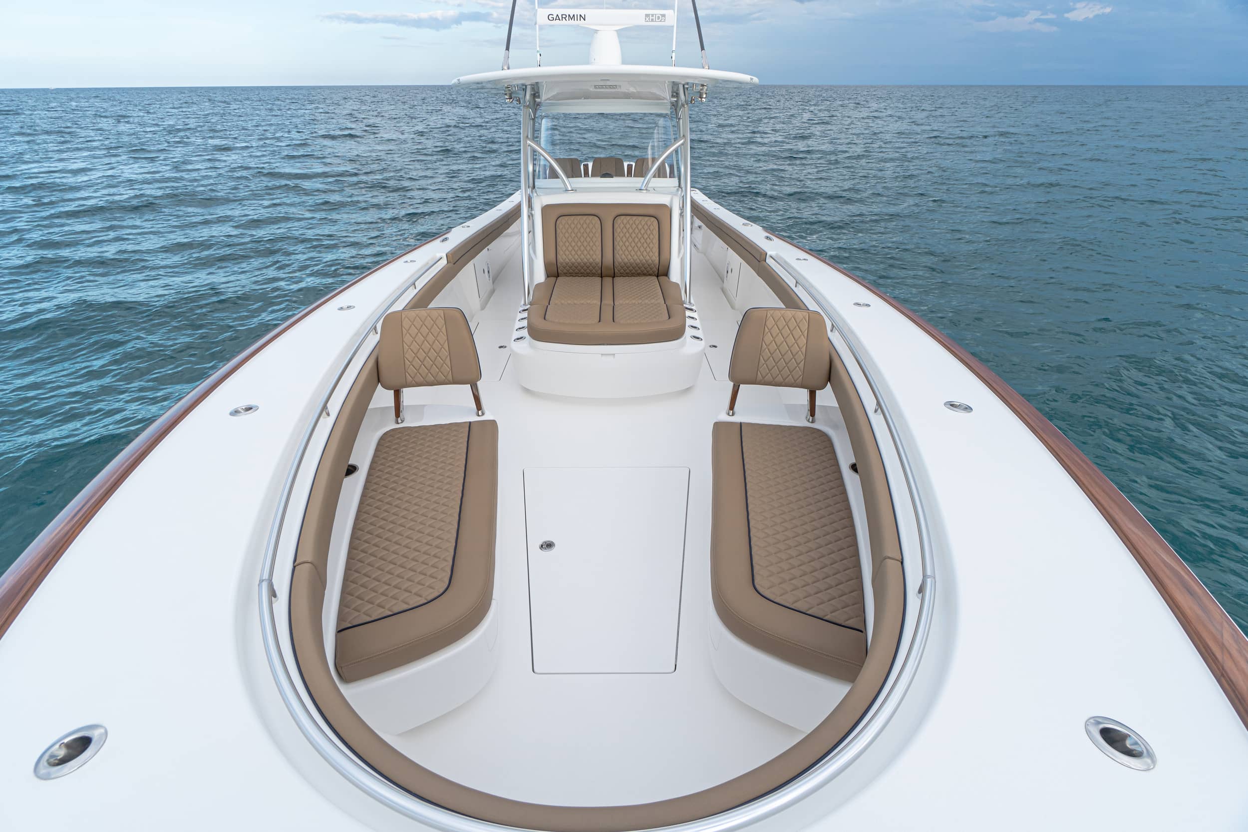 The V-41 is designed and built to fish, but the flagship also excels as a luxury tender or a sleek sport cruiser with a diverse deck layout choices that include an aft mezzanine seating module complete with armrests and an insulated cooler (or live well) under the seat. Forward seating with backrests, an anchor windlass, a port-side dive door and additional cup holders round out the day-cruising conveniences and more.