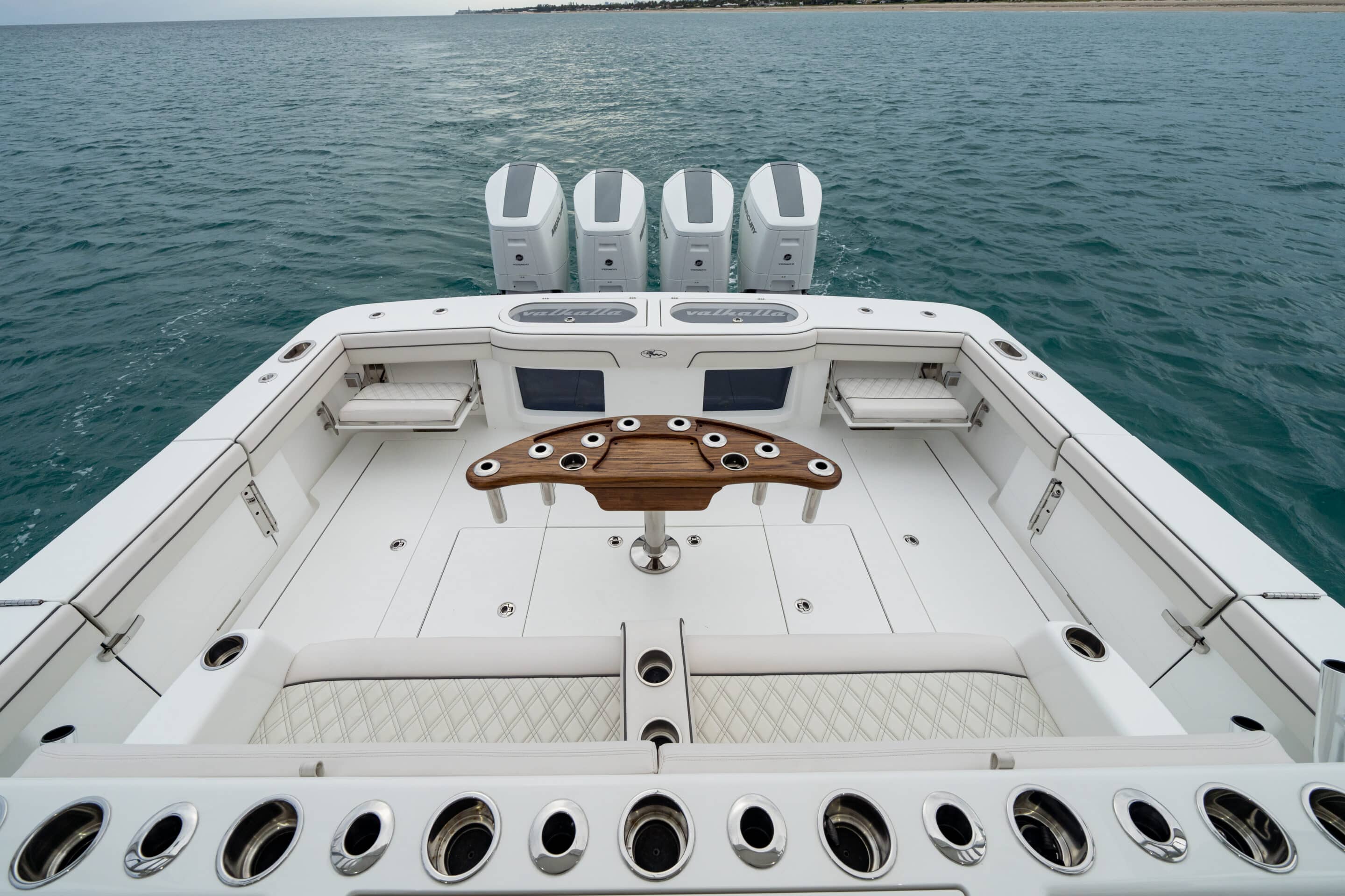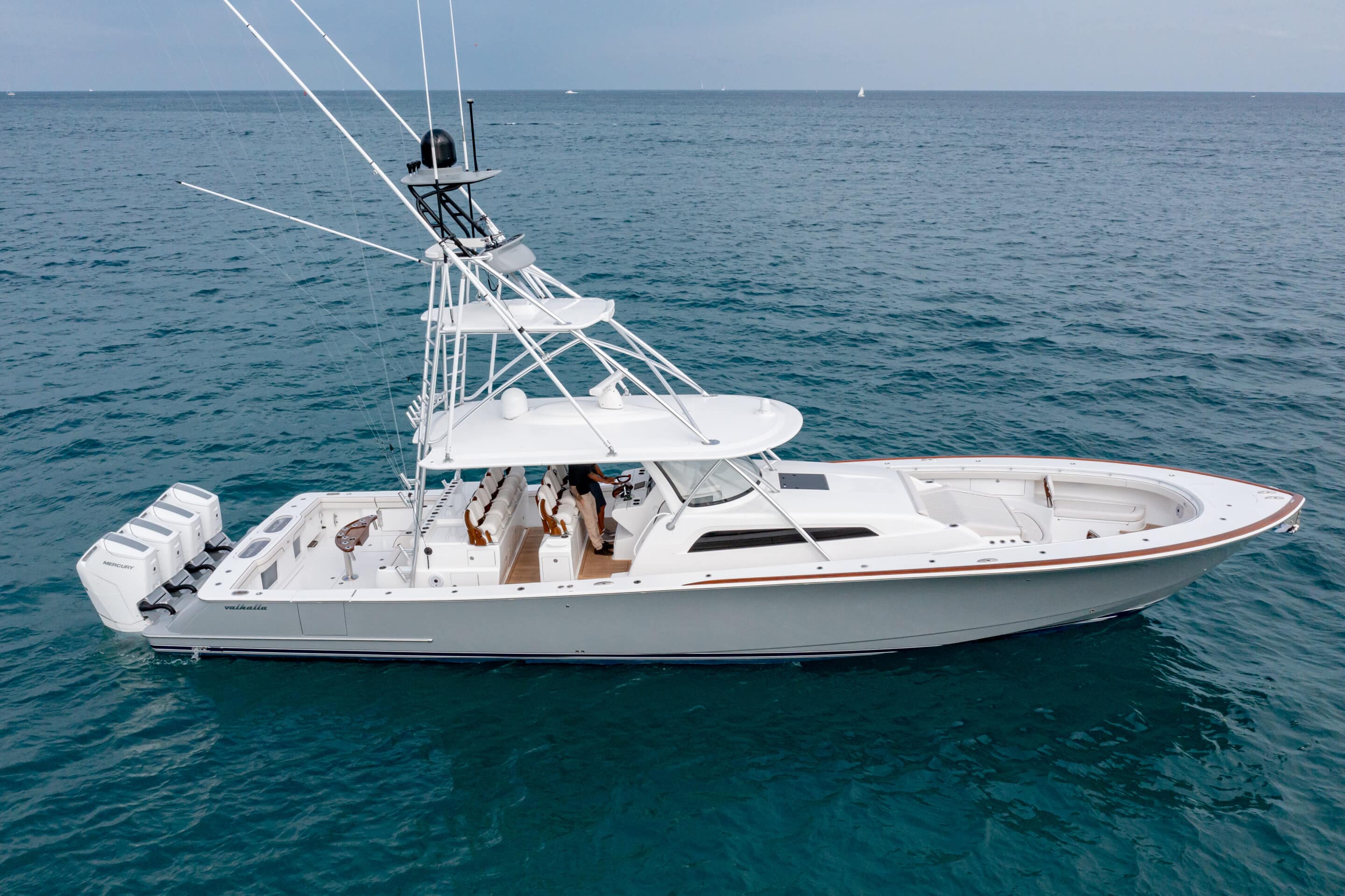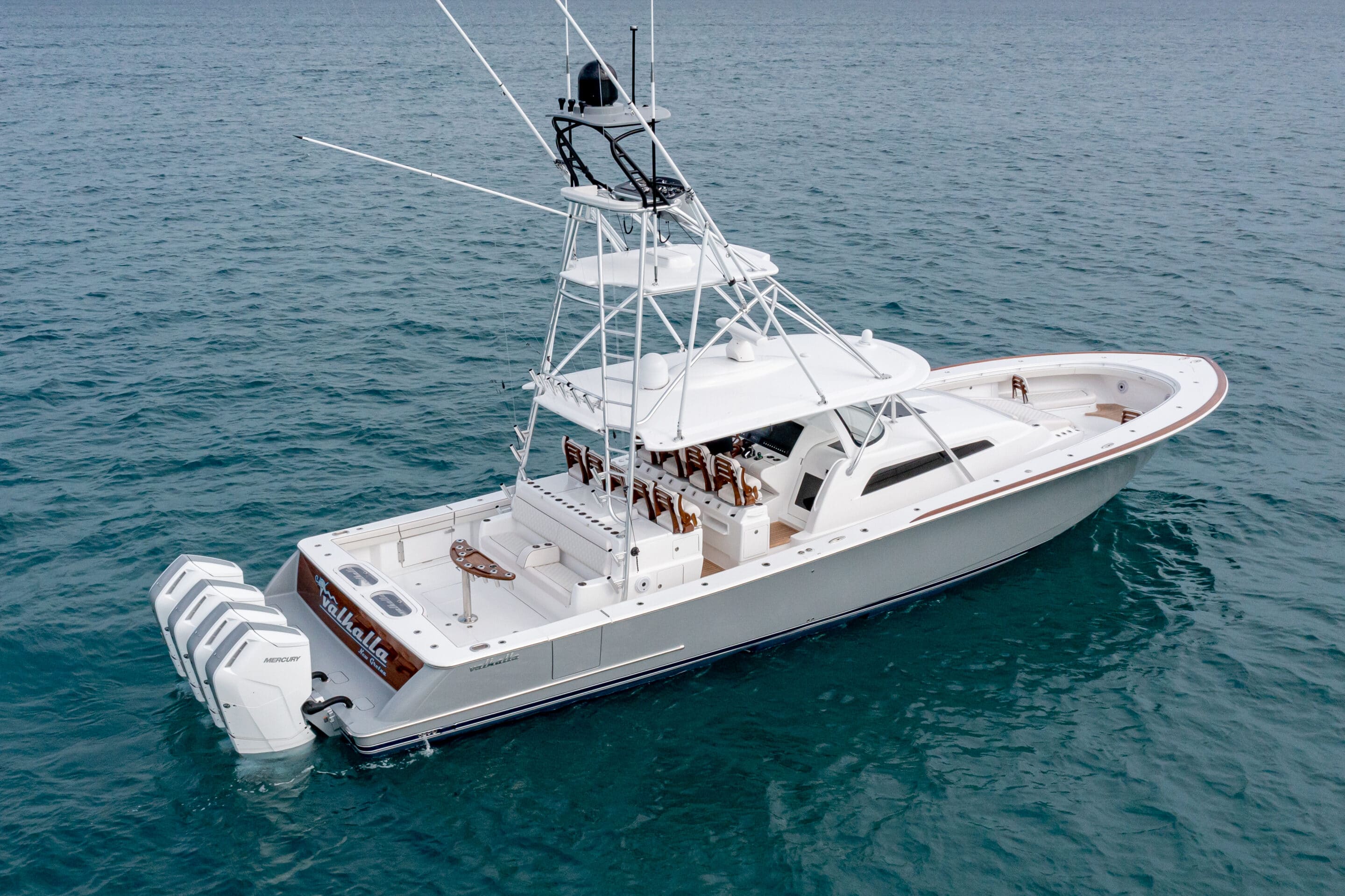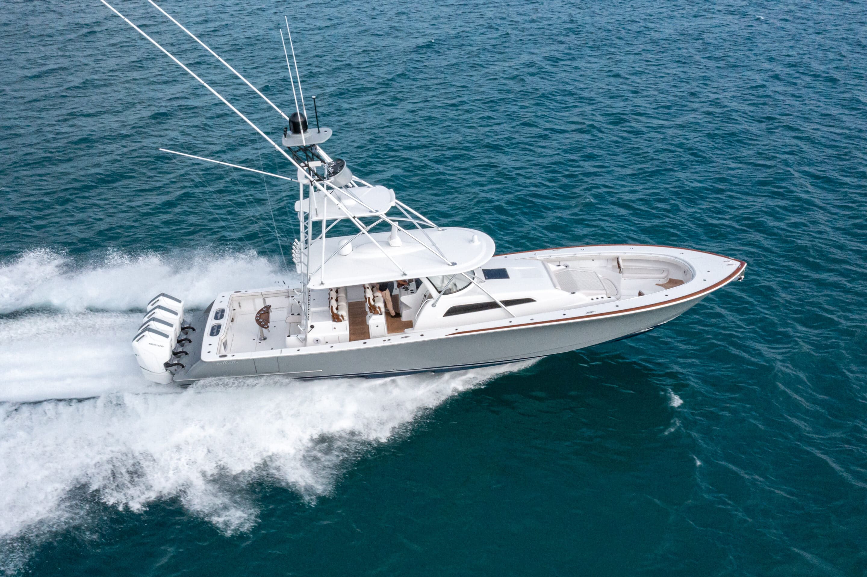 The Valhalla V-55 is the ultimate high-performance luxury centre console, combining the speed and versatility of an outboard-powered boat with the engineering, accommodations, and fishability of a Viking sportfishing yacht. With its 15’6″ beam, unmatched fuel capacity, and precision craftsmanship, the V-55 delivers an unparalleled experience for offshore adventures, tournament fishing, or leisurely cruising. Powered by Mercury’s V-12 600-hp outboards (quad or quint setups), this powerhouse reaches speeds up to 74 mph while maintaining exceptional ride quality and efficiency. Designed for those who demand the best, the V-55 offers spacious interior accommodations, cutting-edge technology, and industry-leading build quality—setting a new benchmark for centre consoles over 50 feet.