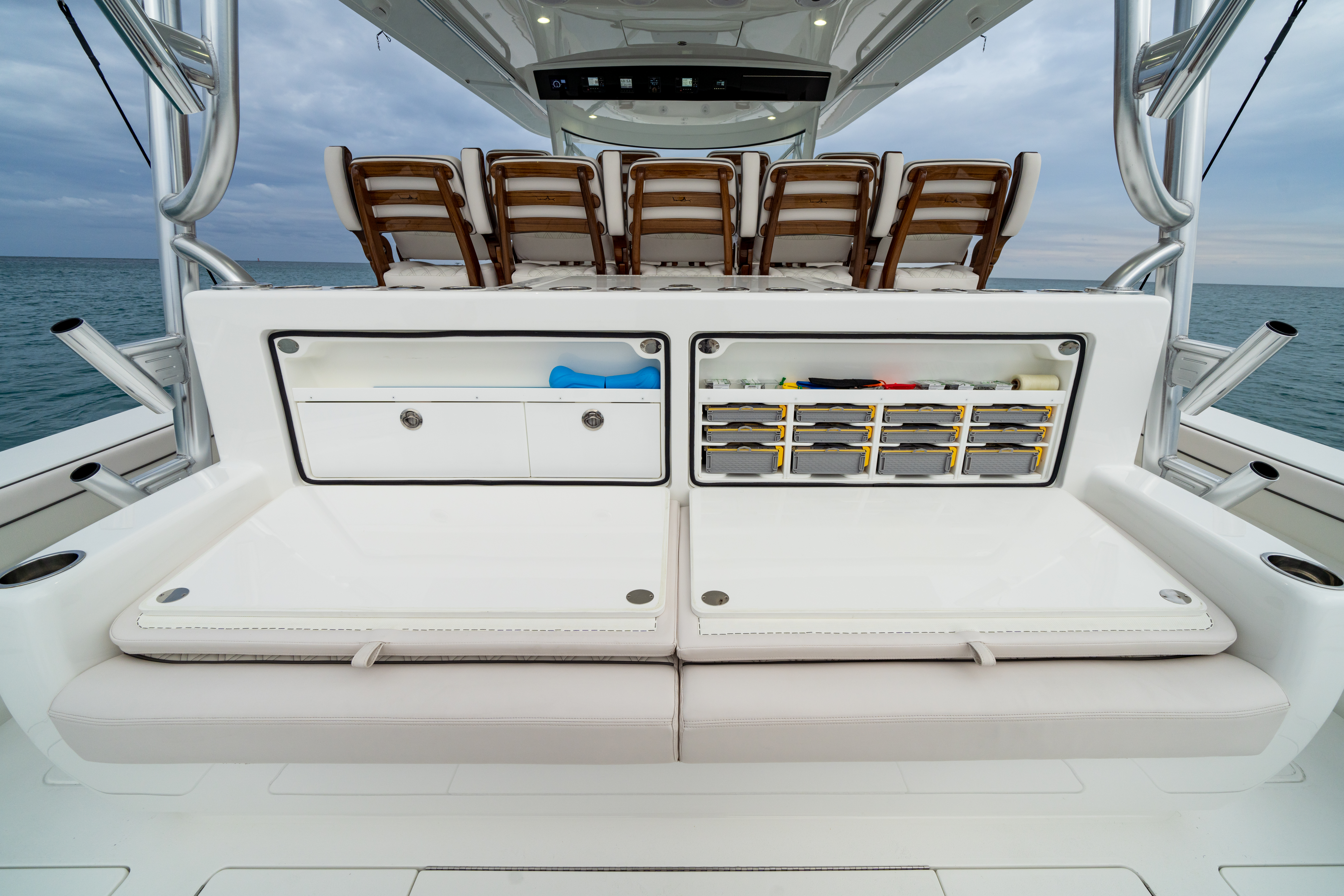 - Upholstered bench seat with tackle storage and (8) Gemlux rod holders with (7) cup holders installed on bench seat backrest