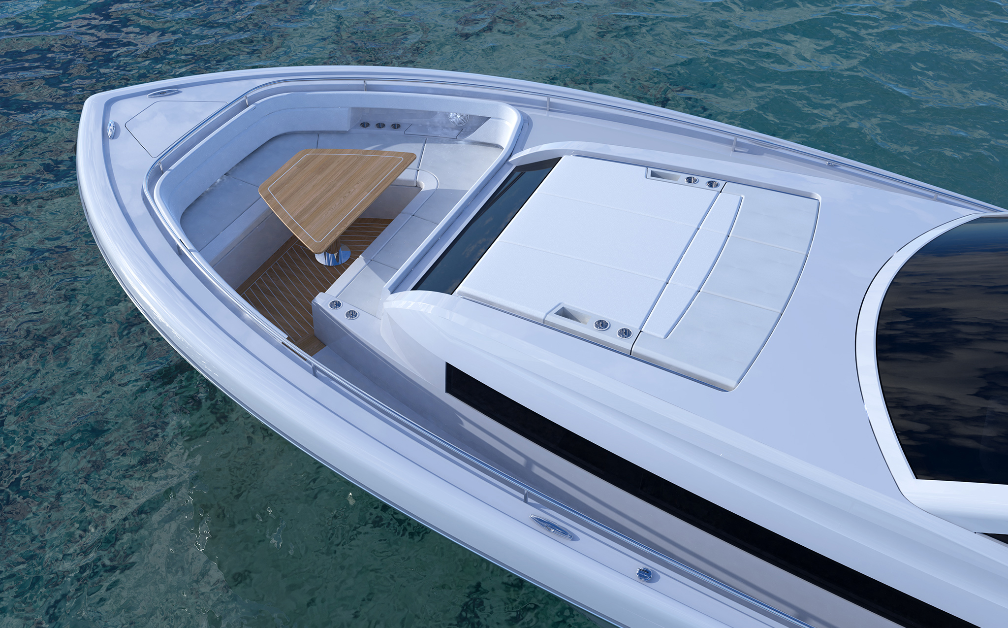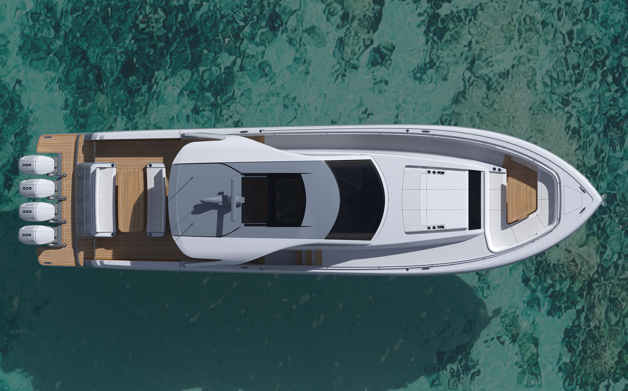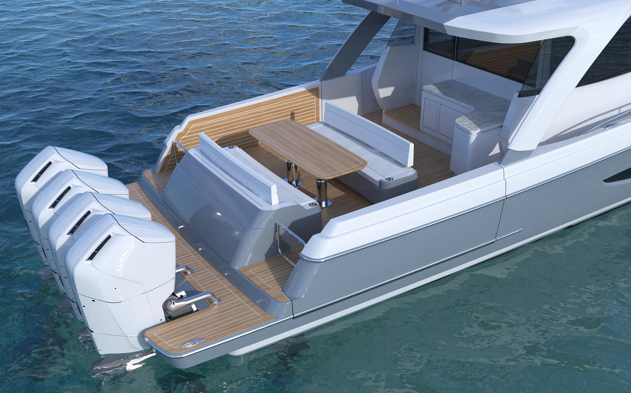 Boarding platforms outboard of the engines lead to a pair of glass doors that provide cockpit access. Designed for maximum relaxation and outdoor entertaining, the cockpit features a large dining area with two bench seats and a table. An L-shaped summer kitchen is just forward and to starboard. The yacht features powered fold-down balconies on each side with integrated boarding ladders. “The balconies consist of the entire aft sections of the hull sides, completely opening up the cockpit,” says Viking Design Manager David Wilson. “Each platform is 25 square feet, giving you more deck space and easy water access.”