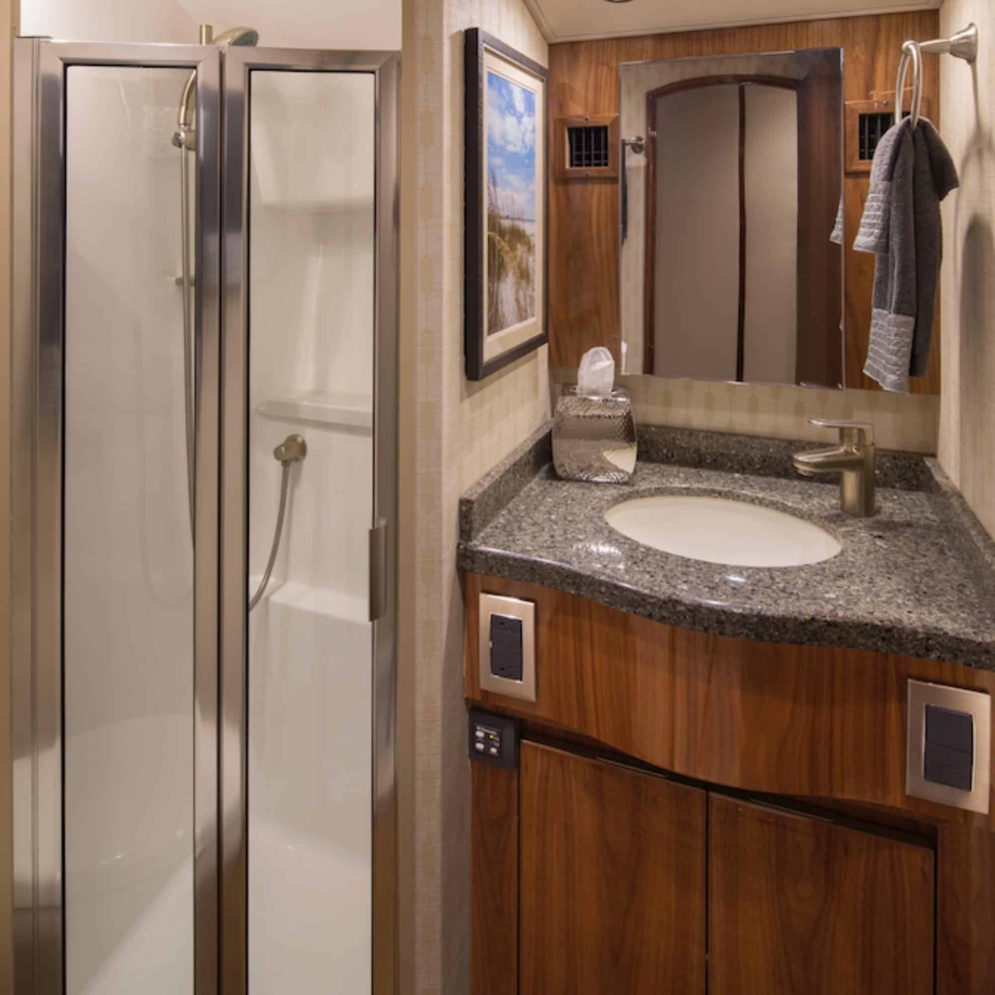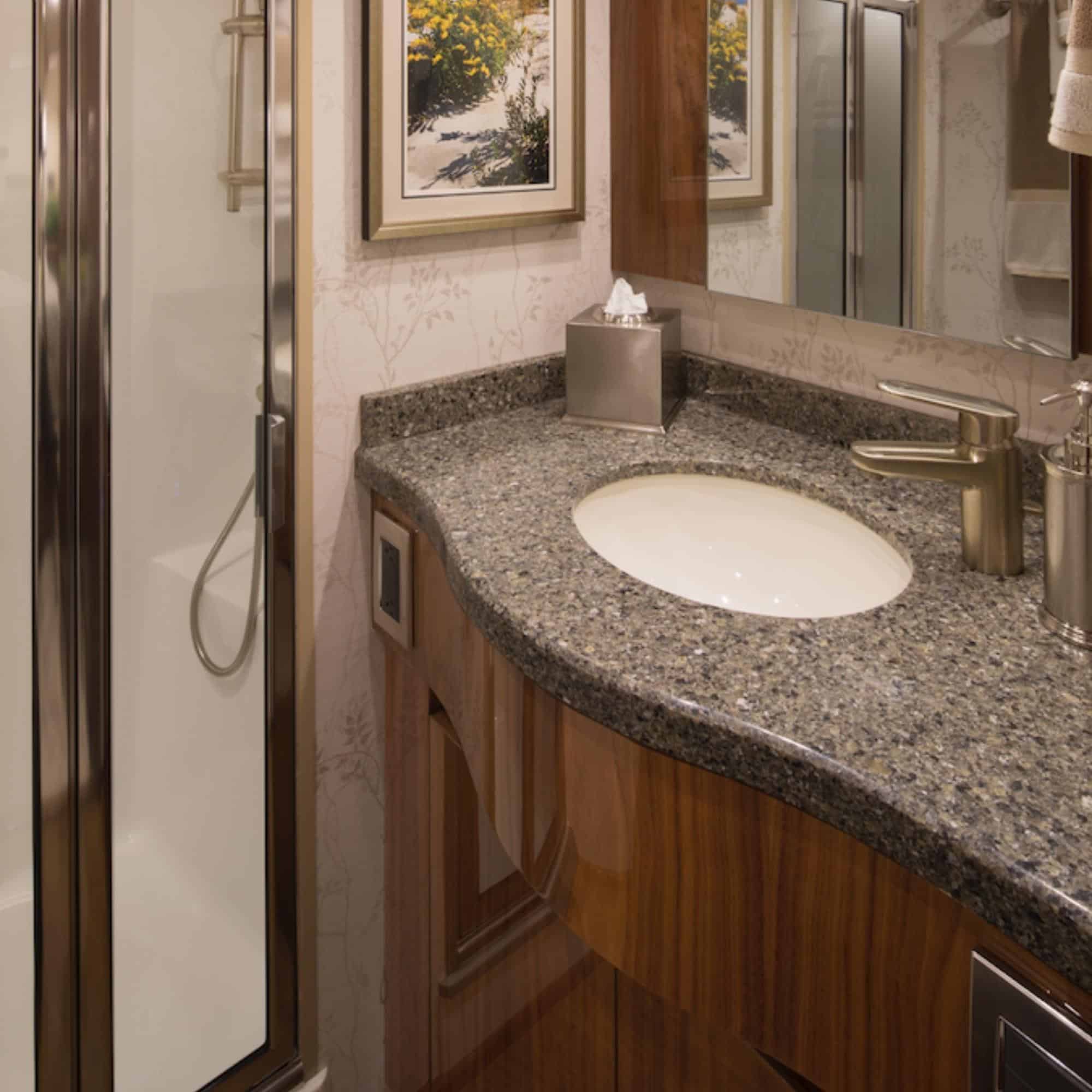 refrigeration, a microwave/convection oven, Cambria countertops and stowage galore.