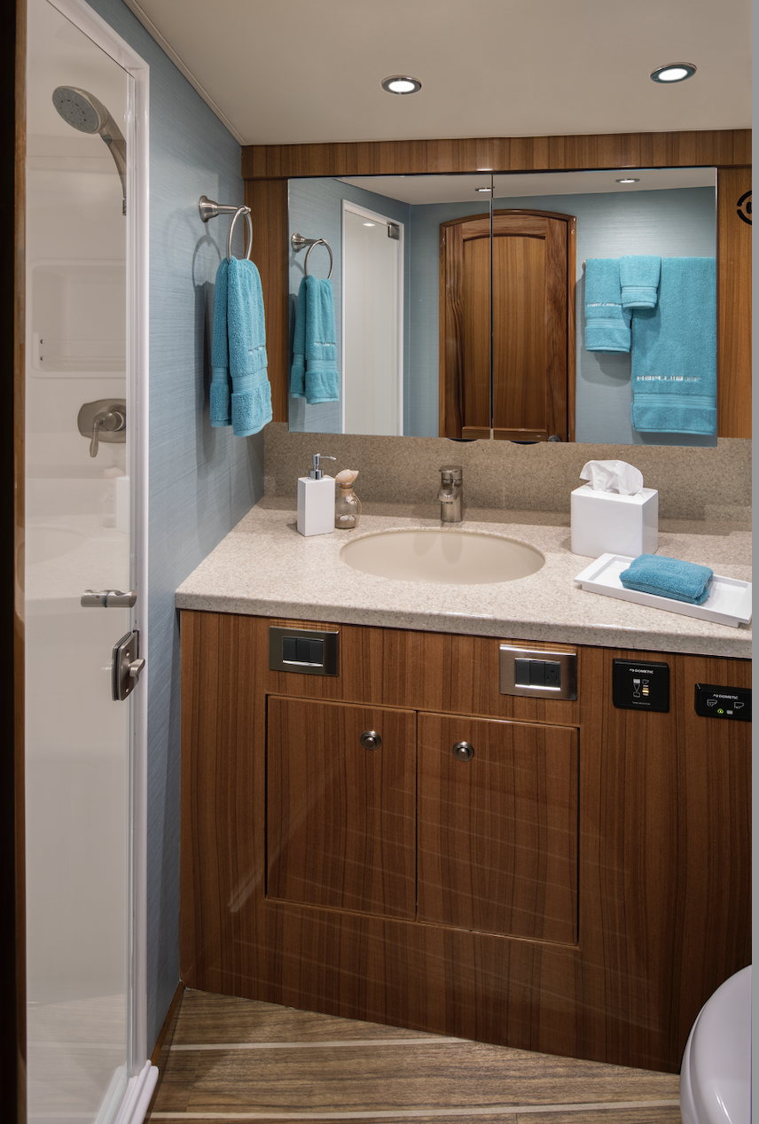 - Stall shower, fiberglass with satin nickel fixtures and drain to automatic sump pump in bilge