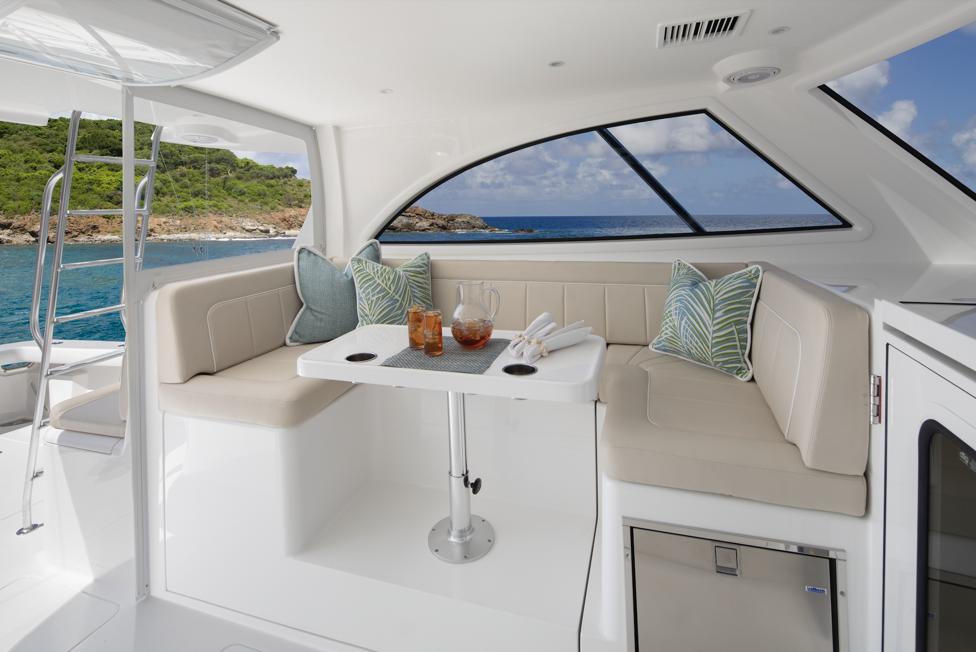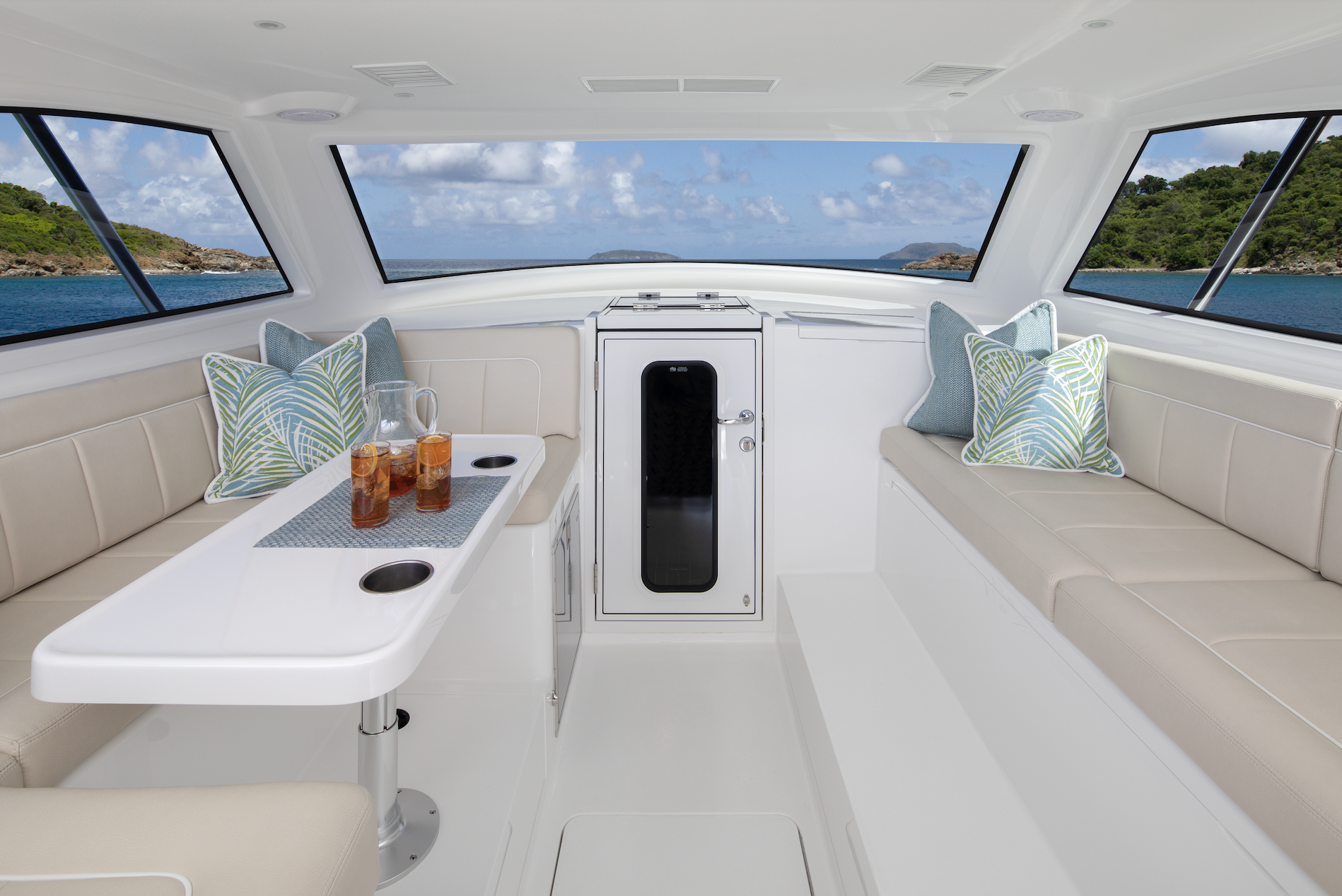 - Port side U-shaped lounge seating, with bolstered white vinyl cushions, and fiberglass hi-low table, electrically actuated for engine access