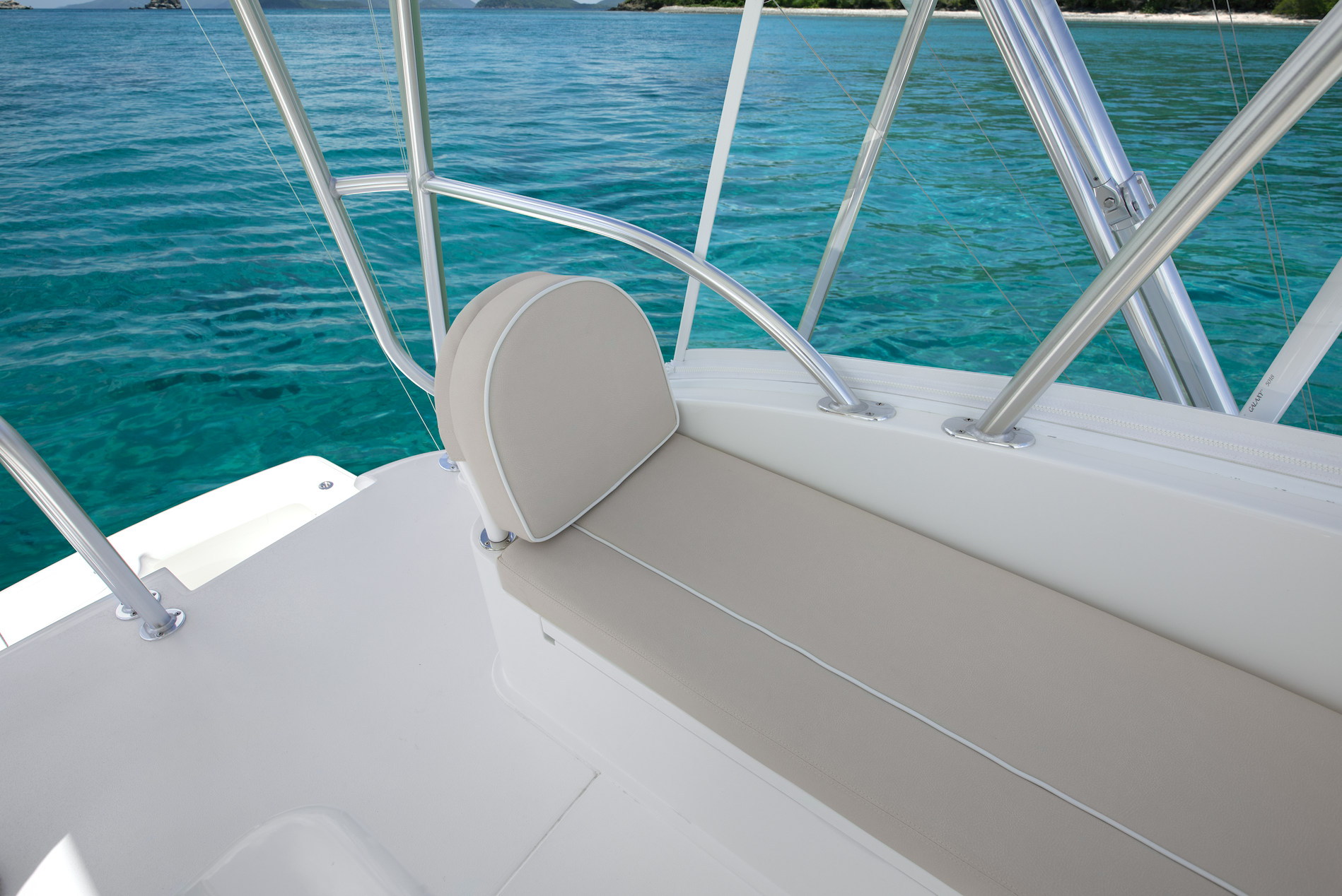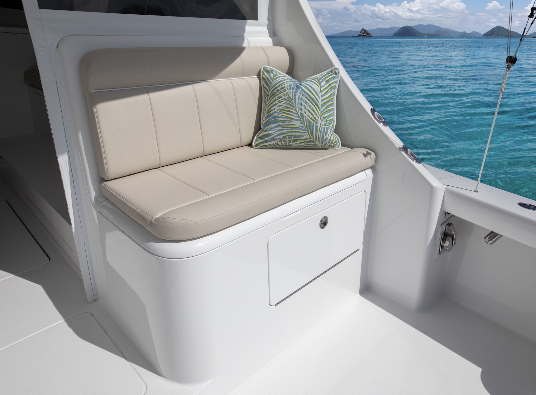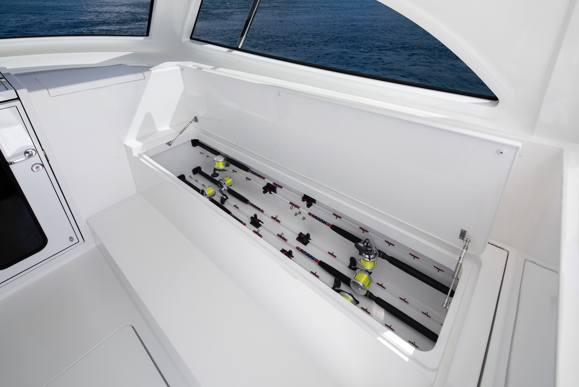 - Starboard side bench seating with rod storage with bolstered white vinyl cushions, electrically actuated for engine access