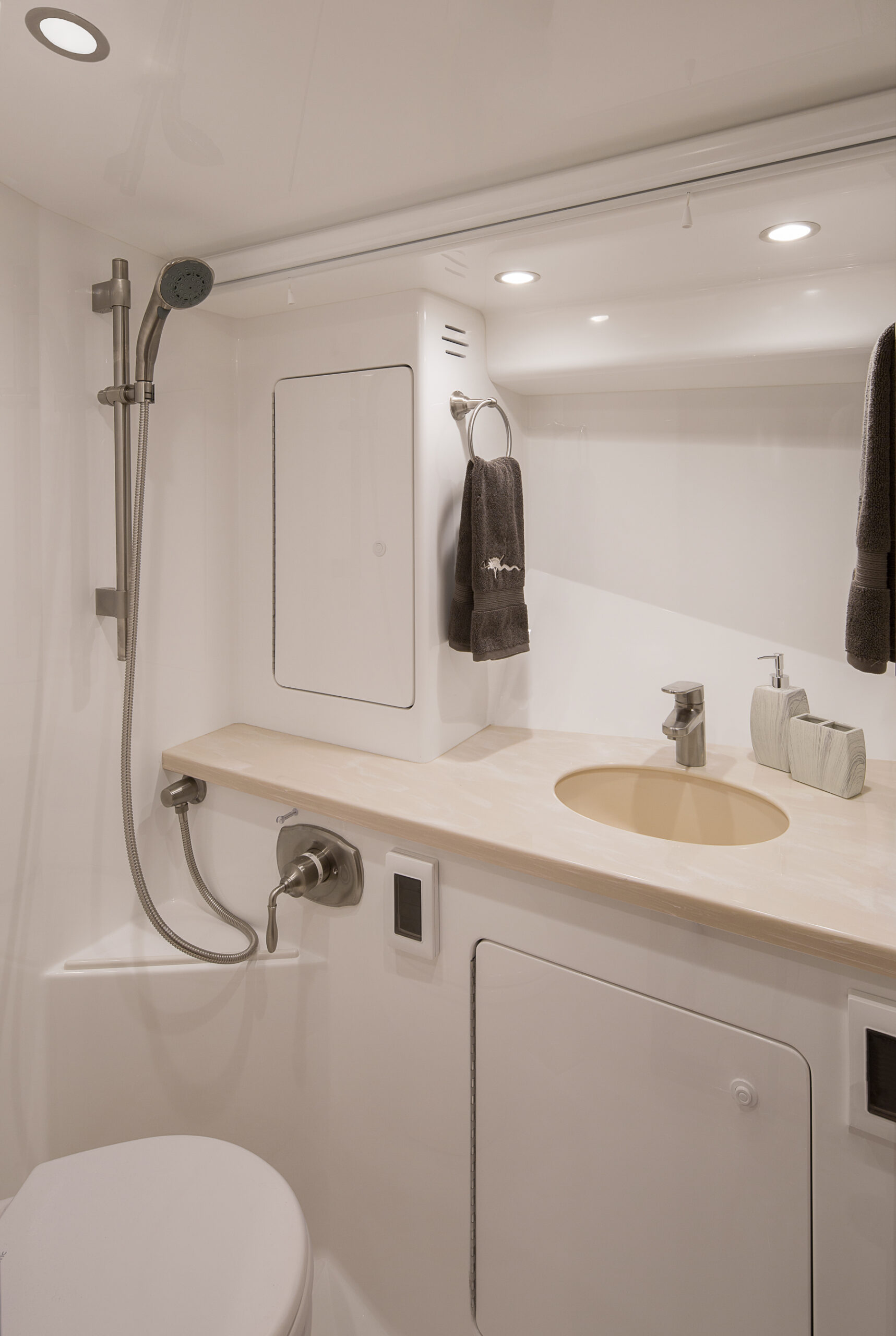 - Exhaust fan with vent • Integrated shower with drain, fibreglass with satin nickel shower fixtures and with drain to automatic sump pump in bilge