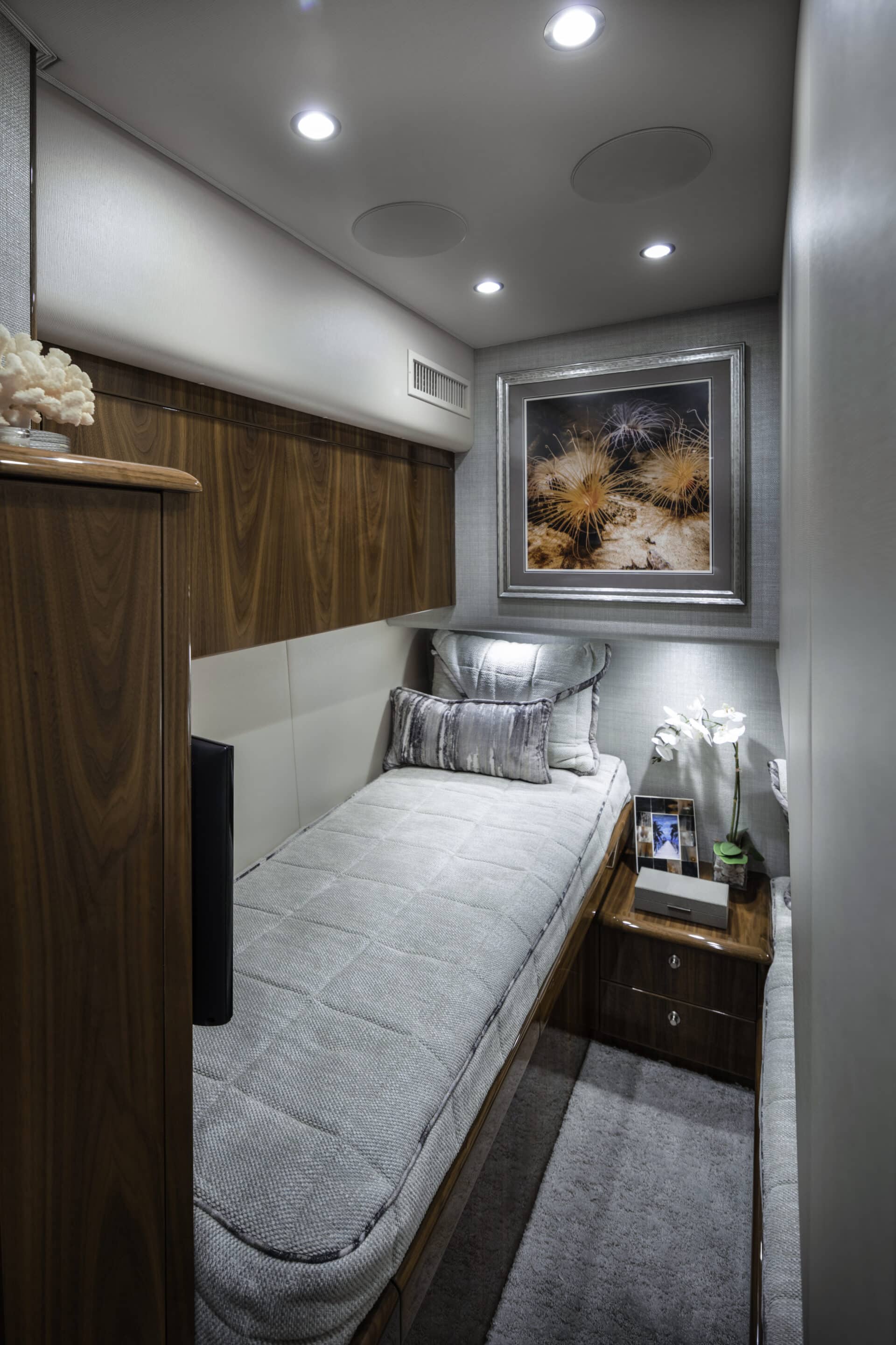 - Stereo speakers recessed, tied into salon stereo with remote control