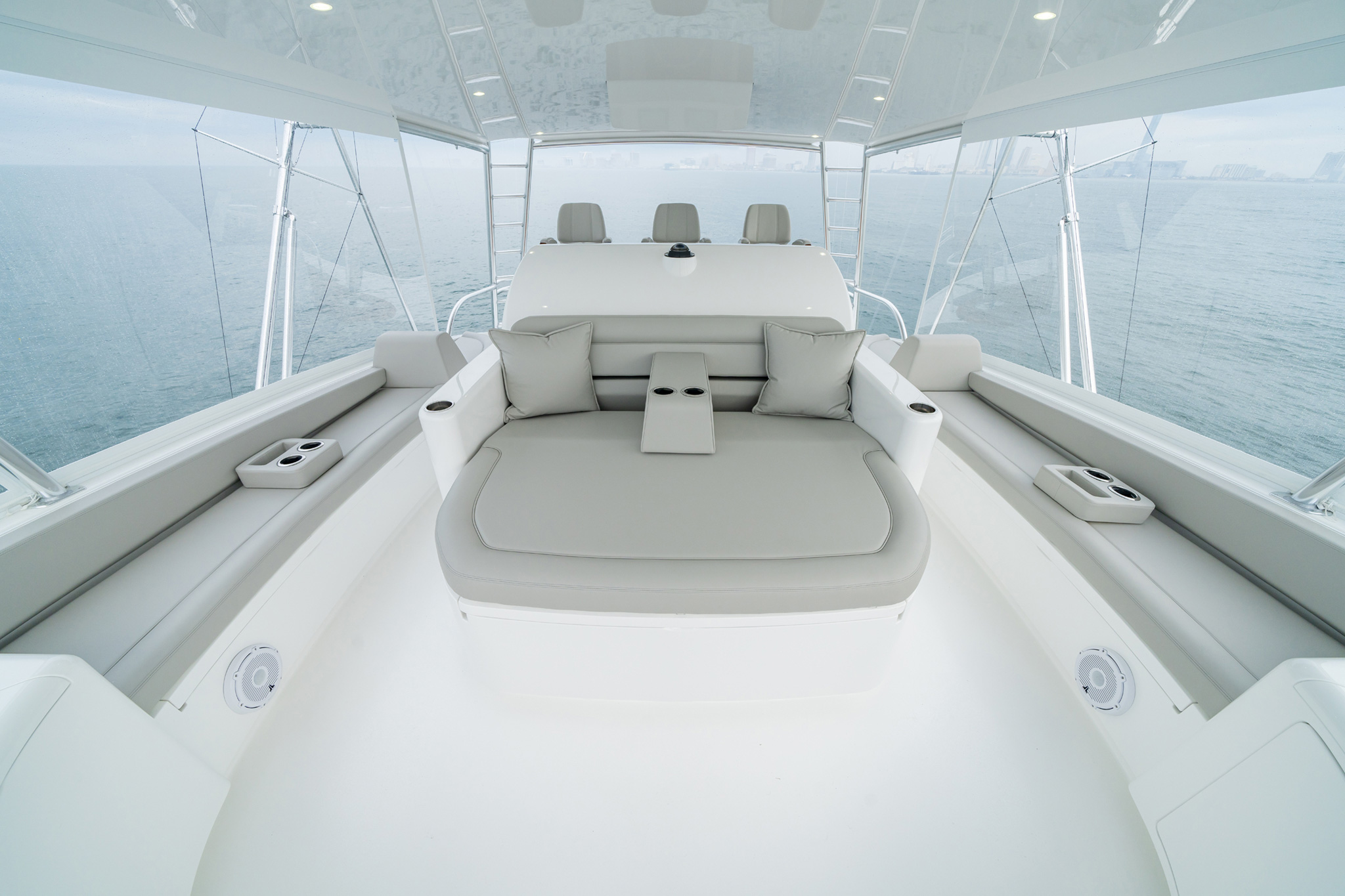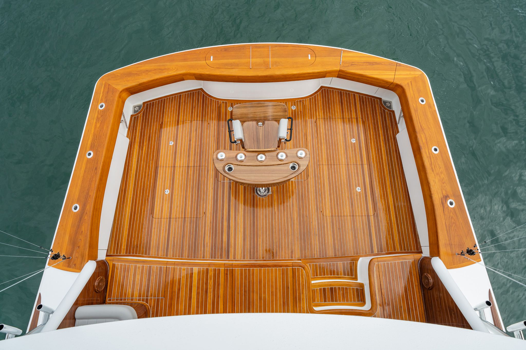 • Extended overhang for extra room to move behind helm and companion seats with anodized aluminium aft railing
