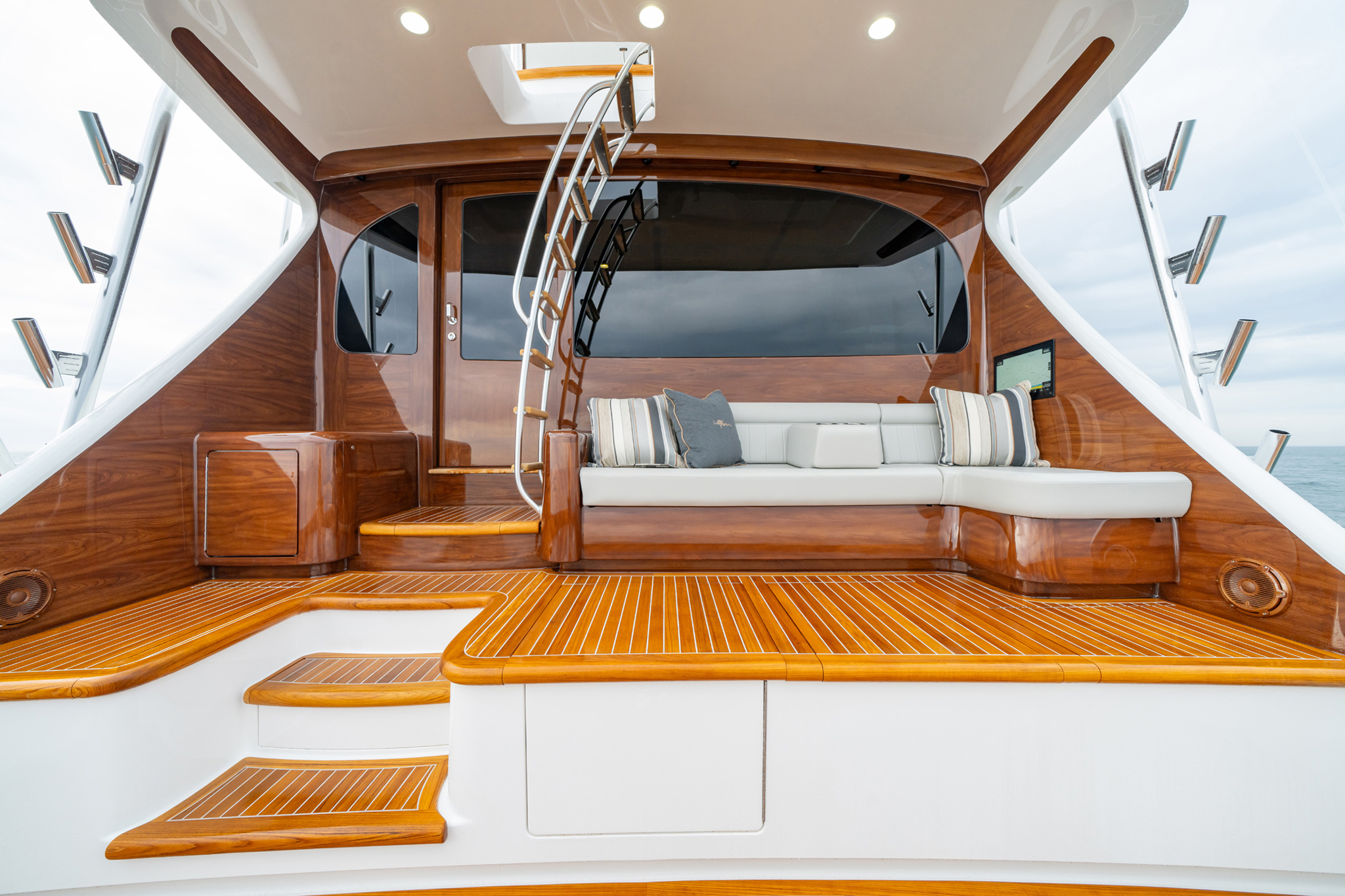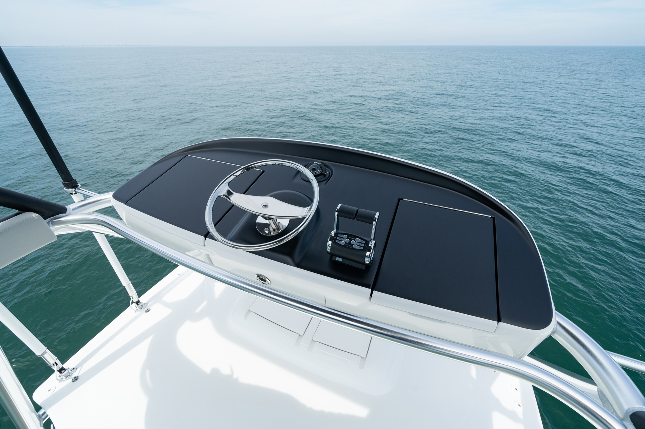 • Custom helm pod with single lever electronic controls with bow thruster control buttons and stainless steel steering wheel