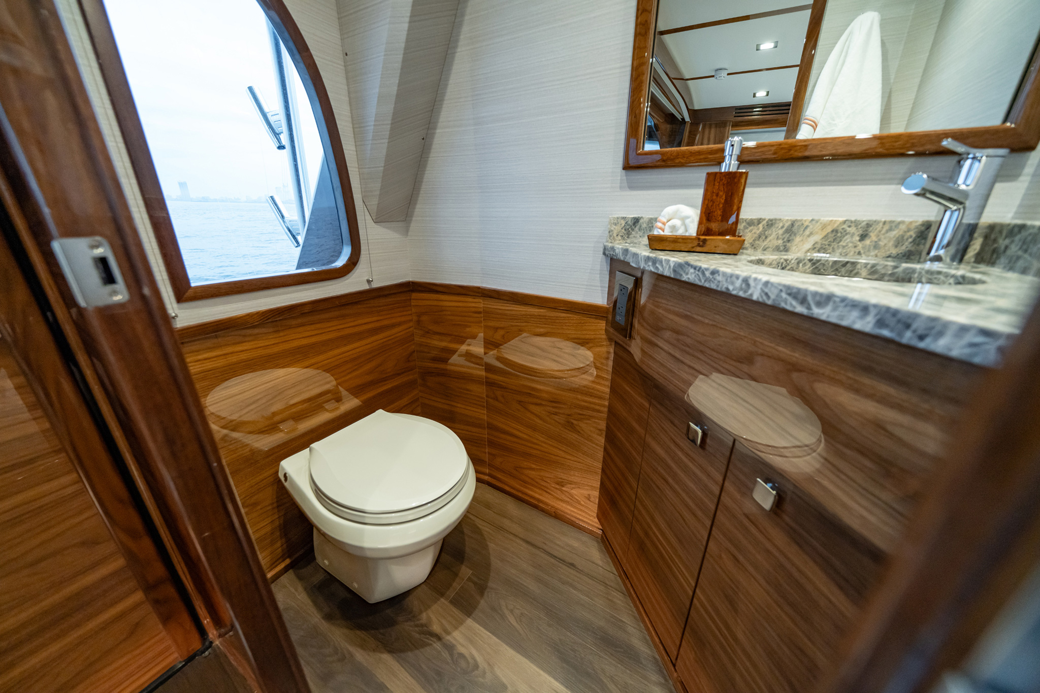 • Dual stage variable speed 110V AC freshwater system with on deck freshwater fill and cockpit dockside supply inlet with pressure reducing valve