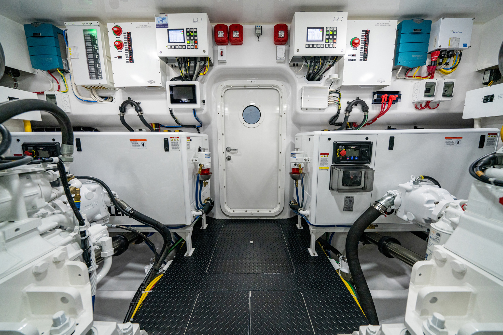 • Fire suppression system, automatically and manually operated and tied into main engine and generator ignition systems with override